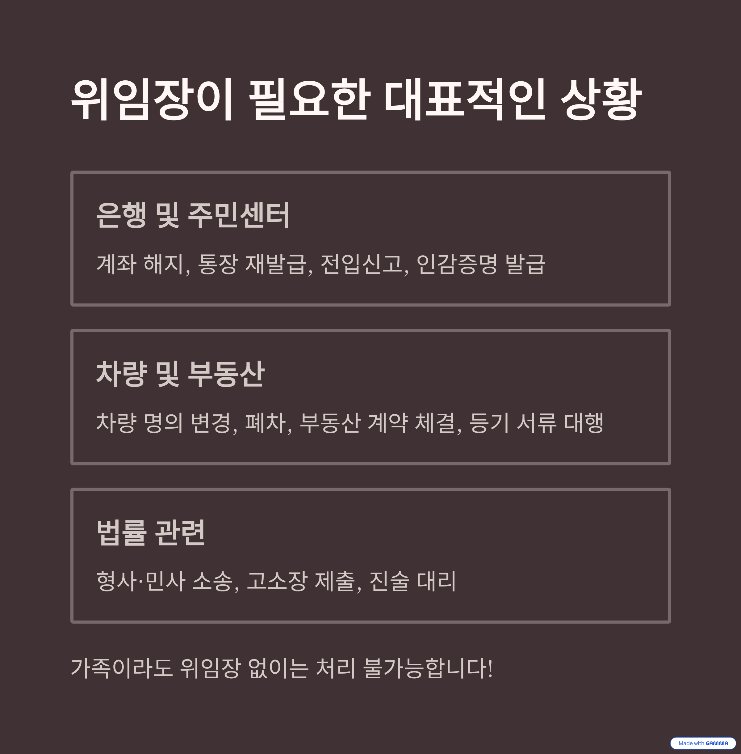 | 은행 업무 대리 처리 | 본인 계좌 해지, 통장 재발급 등 대부분 위임 필수 |