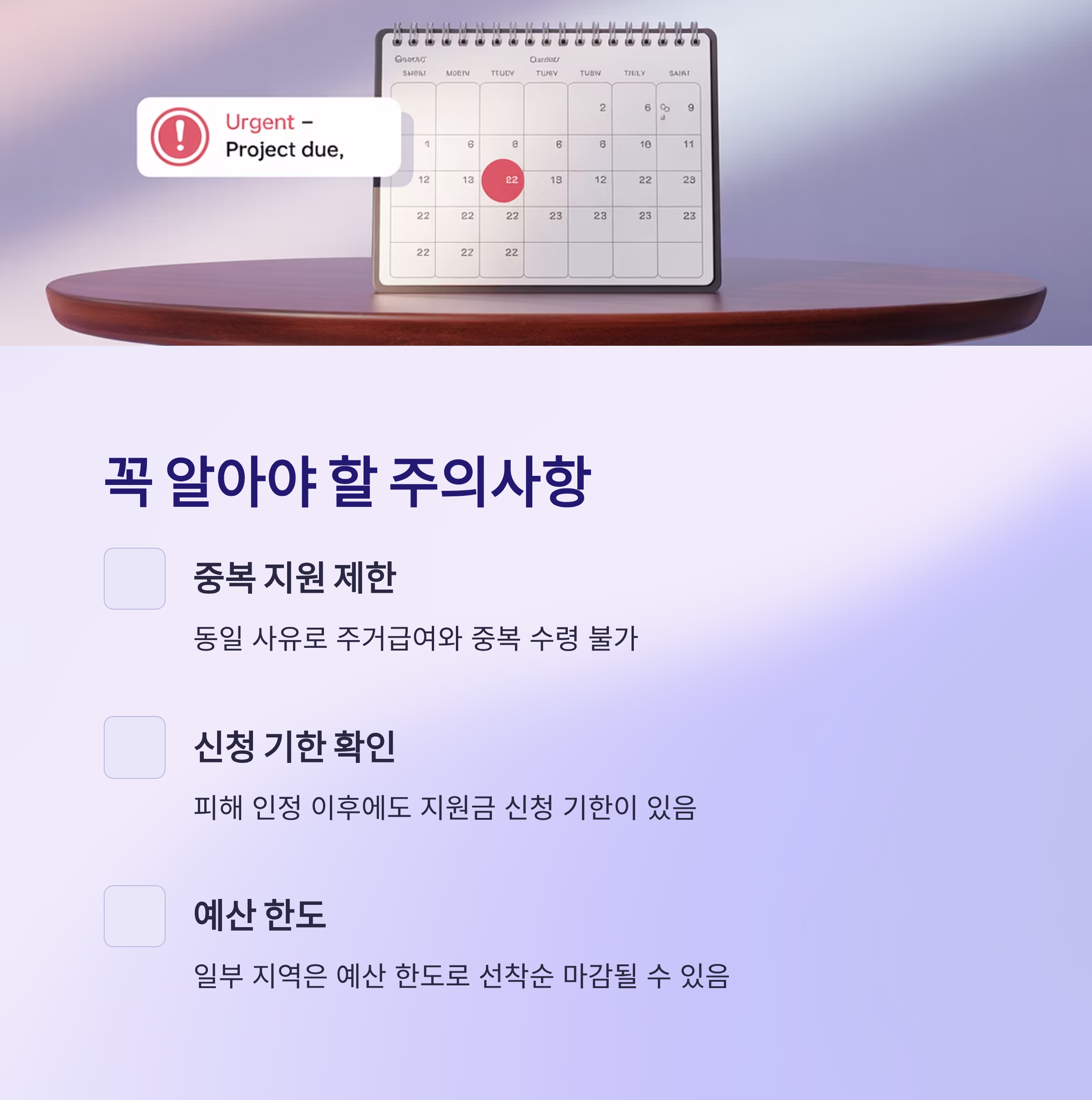 (예: 동일 사유로 주거급여와 중복 수령 불가) - 피해 인정 이후에도 지원금 신청 기한이 있으니 반드시 기간 내 접수해야 합니다.