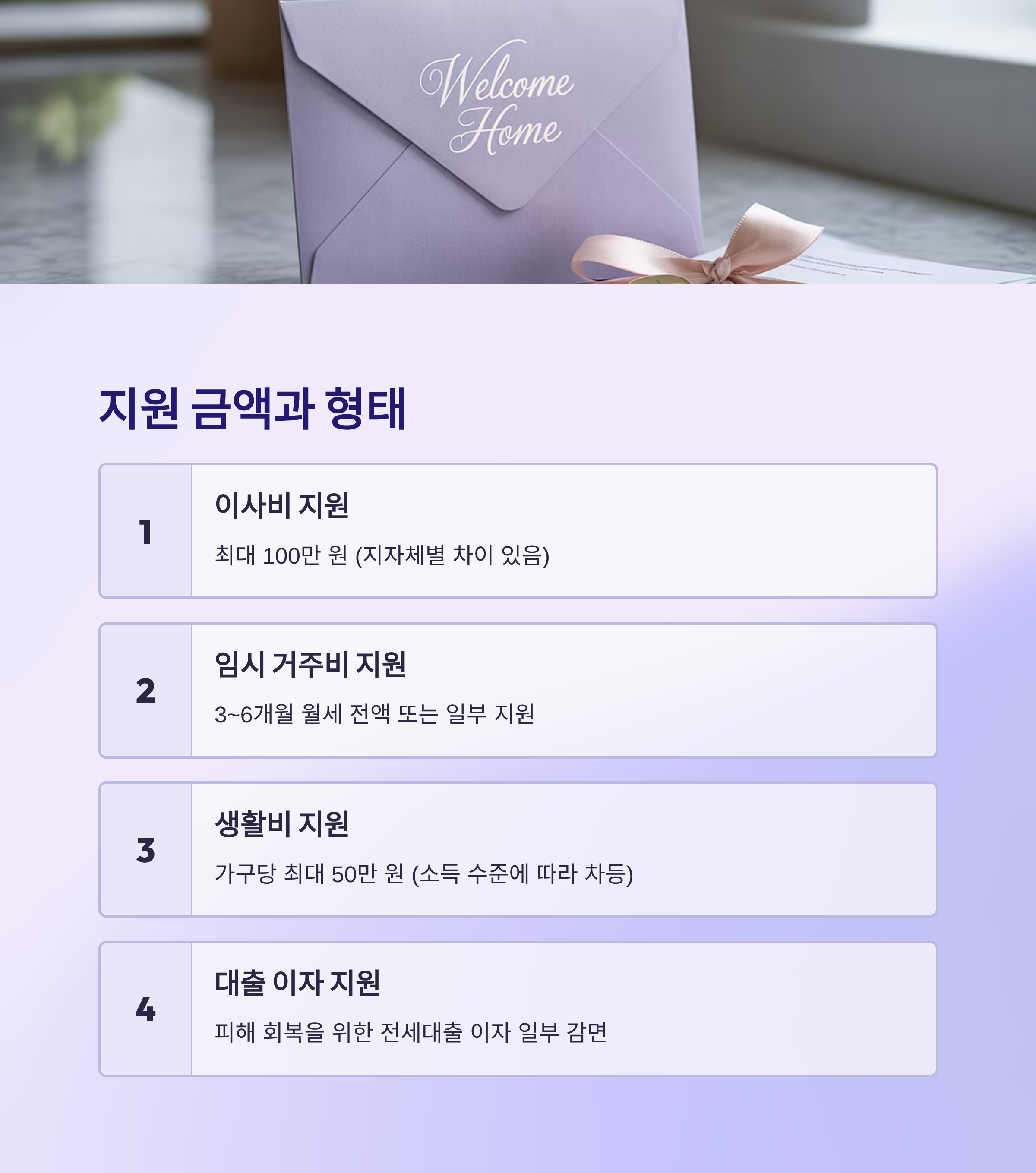 | 임시 거주비 지원 | 3개월~6개월 월세 전액 또는 일부 지원 |