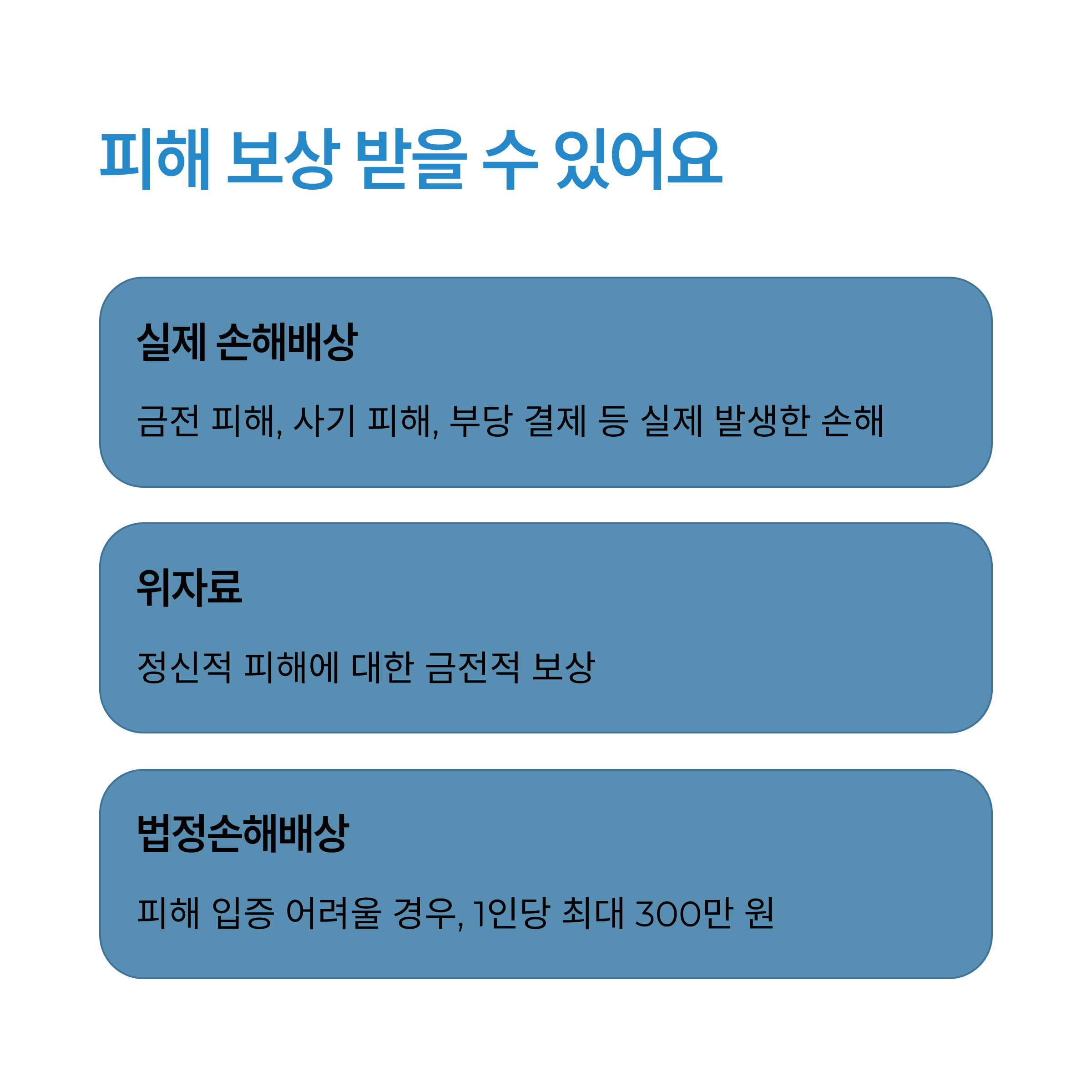 | 실제 손해배상 | 금전 피해, 사기 피해, 부당 결제 등 실제 발생한 손해 배상 |