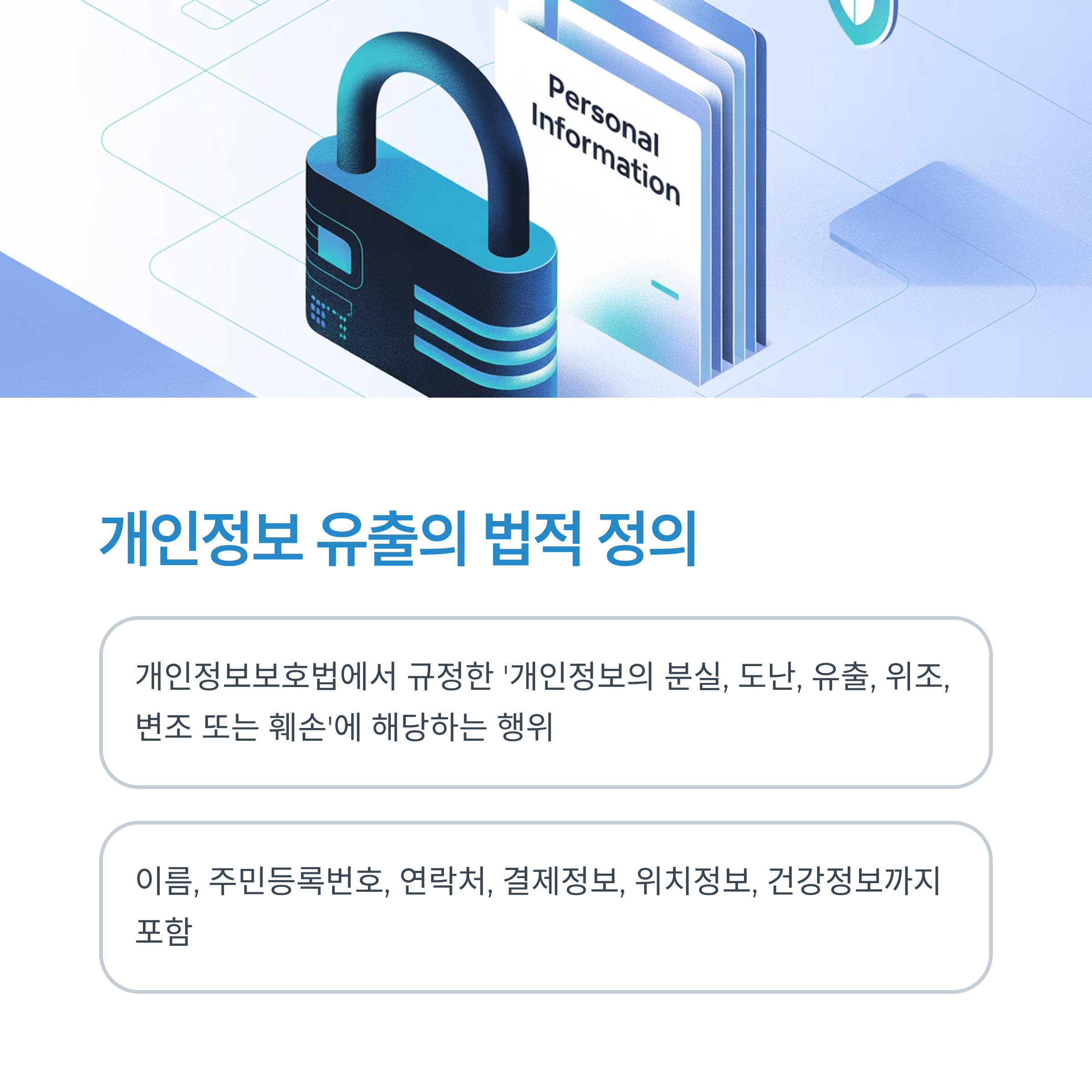 개인정보 유출은 개인정보보호법에서 규정한 ‘개인정보의 분실, 도난, 유출, 위조, 변조 또는 훼손’에 해당하는 행위입니다.