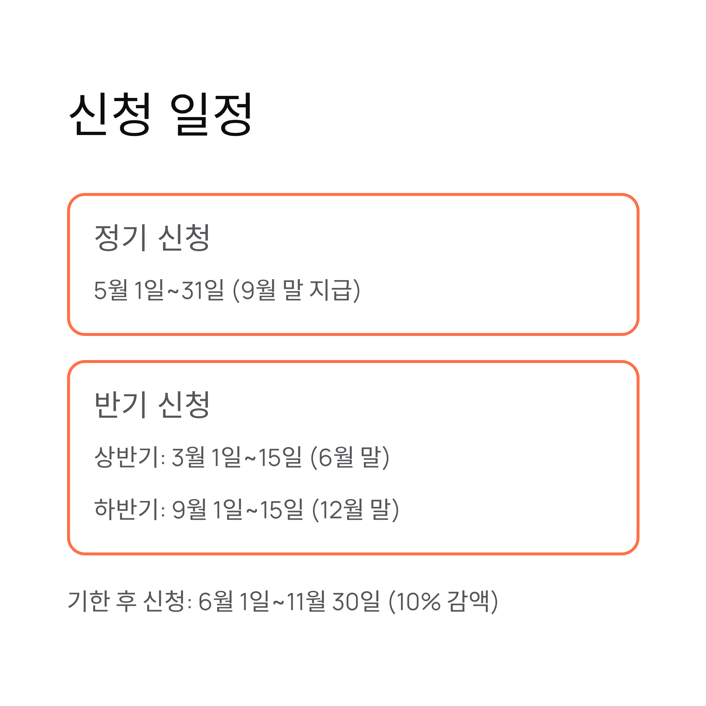 - 기한 내 신청이 원칙이지만, 기한 후 신청을 하면 10% 감액 지급되므로 반드시 5월 내 정기 신청을 권장합니다.