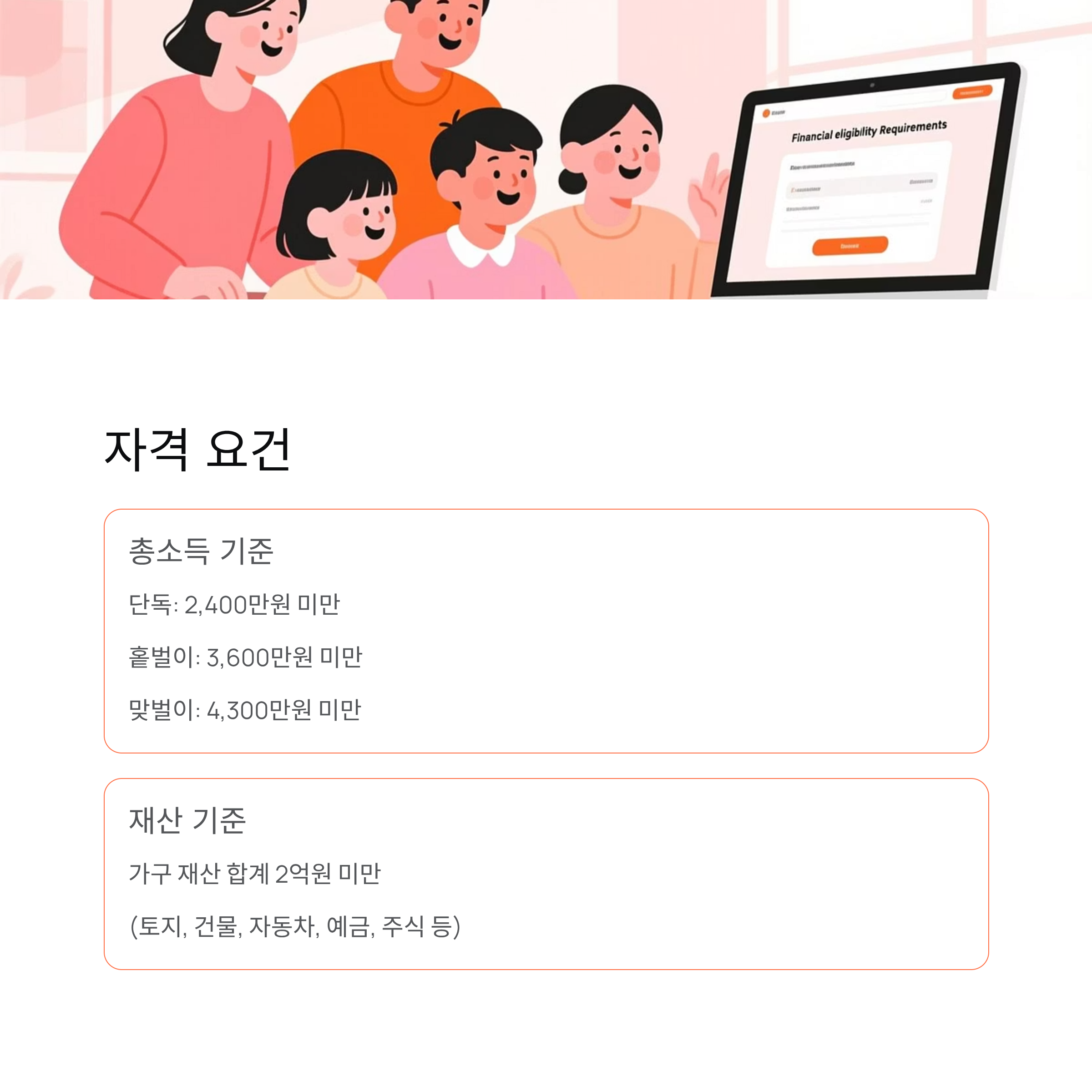 | 단독 가구 | 2,400만 원 미만 | 가구 재산 합계 2억 원 미만 |