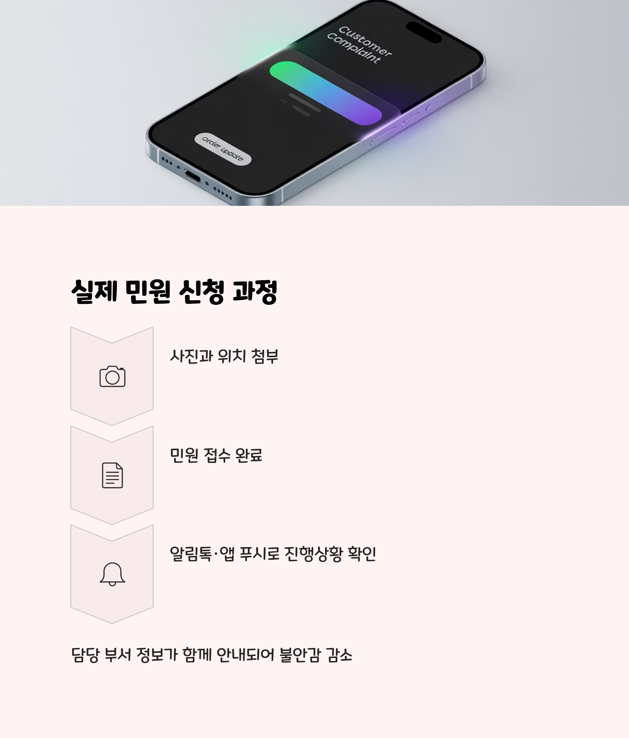 AI 안내에 따라 바로 ‘무단투기 신고’ 메뉴로 이동해 사진과 위치를 첨부하고 민원을 접수했습니다. 접수 후에는 곧바로 진행 상태가 ‘처리 중’으로 표시되었고, 담당 부서 정보가 함께 안내되었습니다. 예전에는 접수만 하고 며칠간 소식이 없었던 경우가 많았는데, 이제는 알림톡·앱 푸시 알림으로 진행 상황을 바로 확인할 수 있었습니다. 민원인이 느끼는 불안감을 크게 줄여주는 변화였습니다.