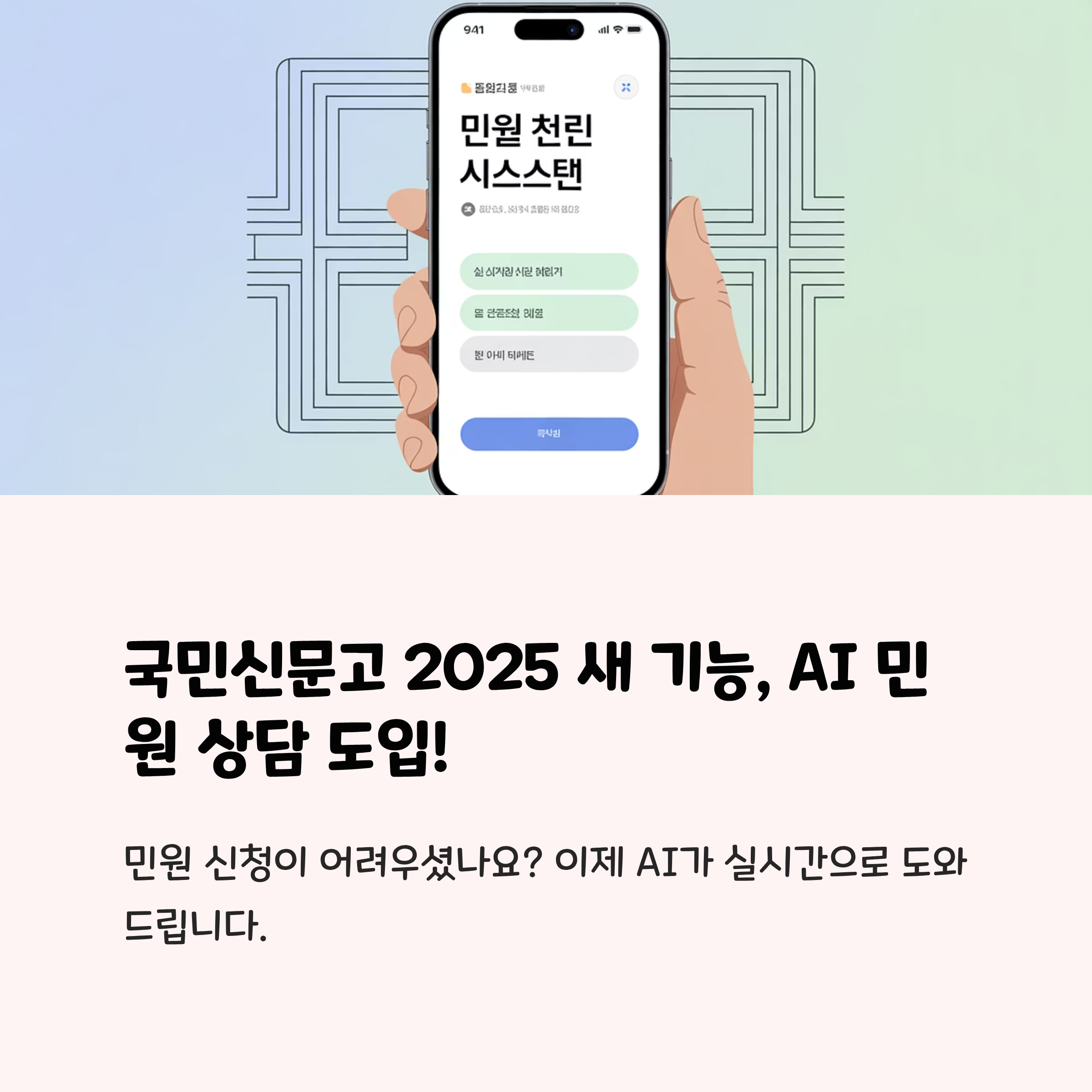 국민신문고 2025 개편의 핵심은 ‘민원인 중심의 편의성’입니다. 특히 AI 상담은 처음 민원을 접하는 사람도 쉽게 활용할 수 있어, 신고 경로를 헤매던 불편함을 크게 줄여줍니다. 앞으로는 민원뿐 아니라 제도 문의, 생활 정보까지 챗봇이 해결해주는 기능이 확장될 예정이라고 하니, 생활 속 불편이 생겼을 때 주저하지 말고 활용해보시길 권합니다.