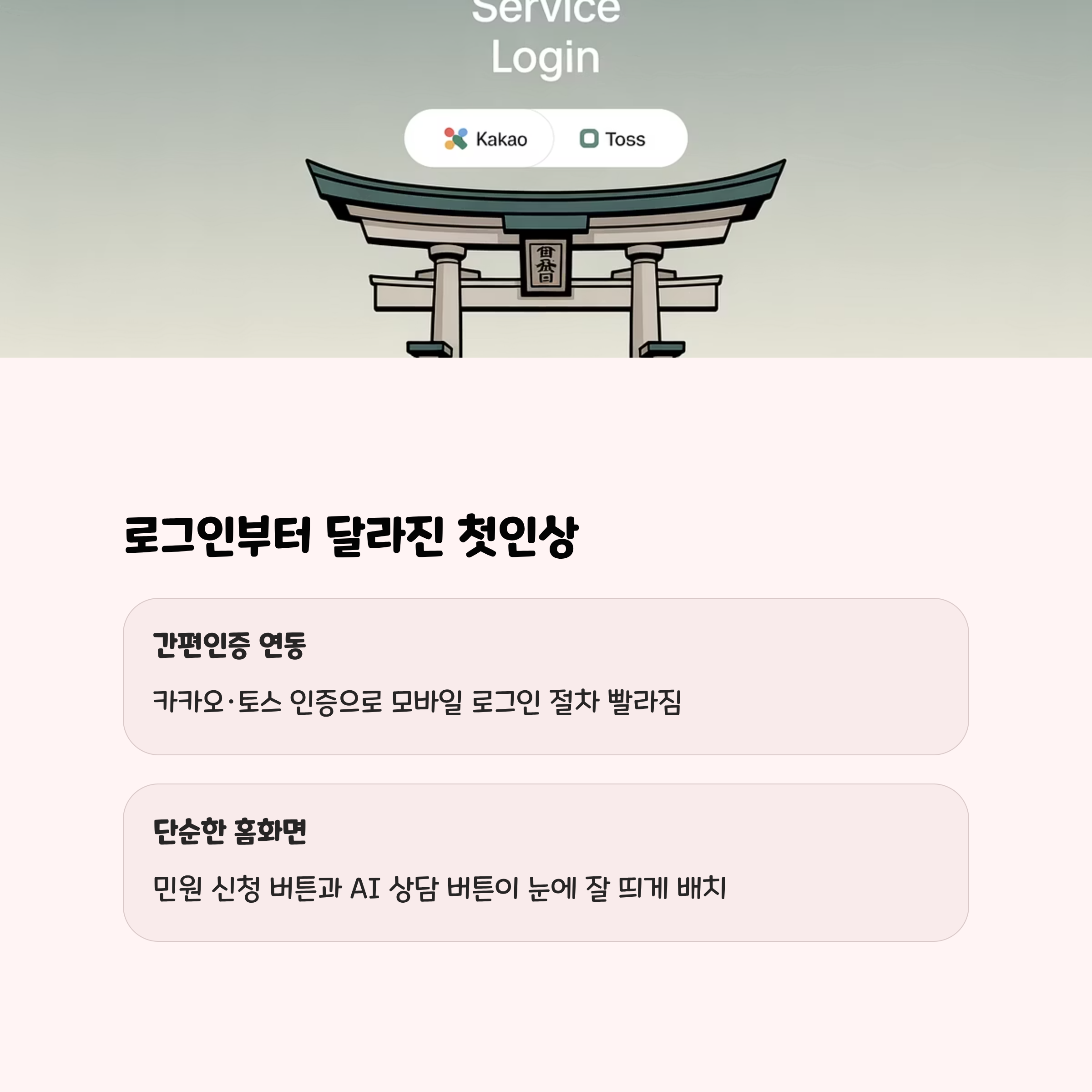 예전에는 공동인증서나 아이디 로그인만 가능했지만, 이번 개편으로 카카오·토스 인증 등 간편인증 연동이 가능해졌습니다. 덕분에 모바일에서 로그인 절차가 빨라졌고, 홈 화면도 단순해져 ‘민원 신청하기’ 버튼이 눈에 잘 들어왔습니다. 특히 상단 검색창과 AI 상담 버튼이 바로 연결되어 있어 필요한 메뉴를 찾기 훨씬 쉬워졌습니다.